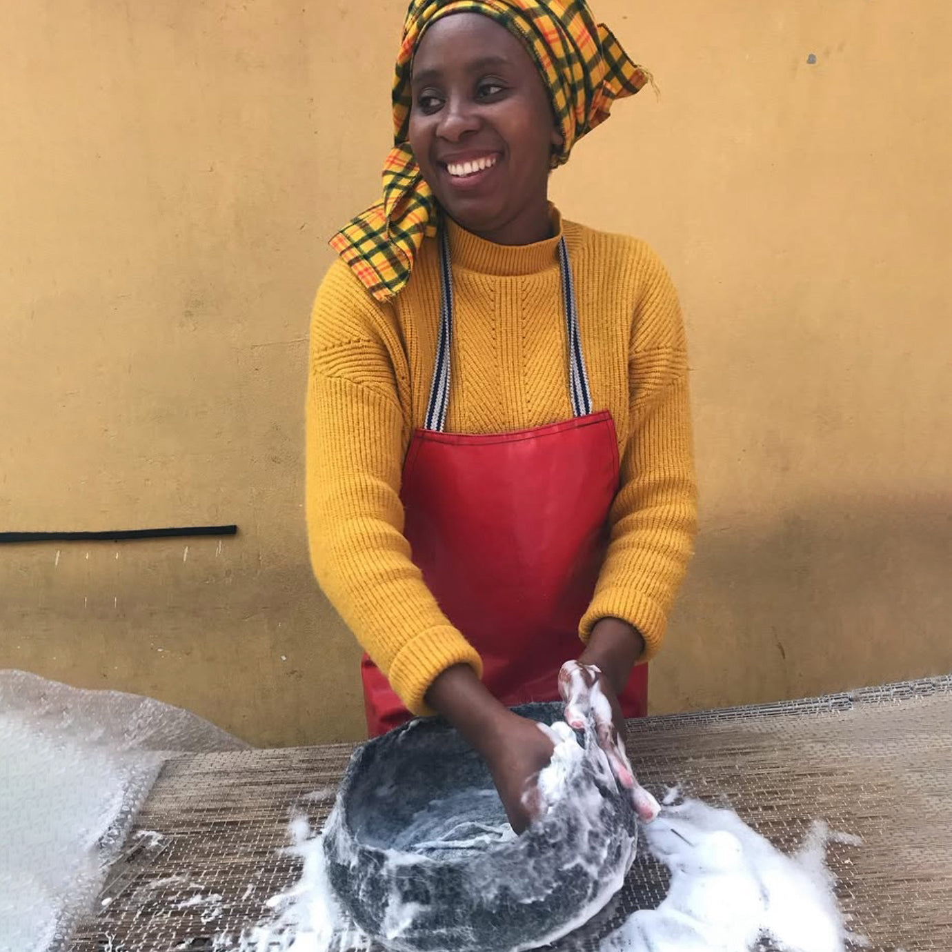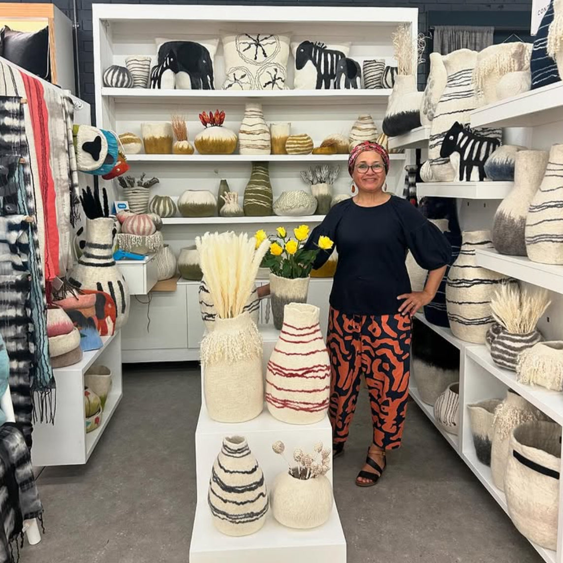 Founder and designer Razaan trains women in the artisan craft of wool bowl making, teaching carbon-free methods in her home studio. They use recycled rain and household water, repurpose leftover fibers into small market goods, rely on natural sun-drying, and ensure every piece is fully biodegradable.